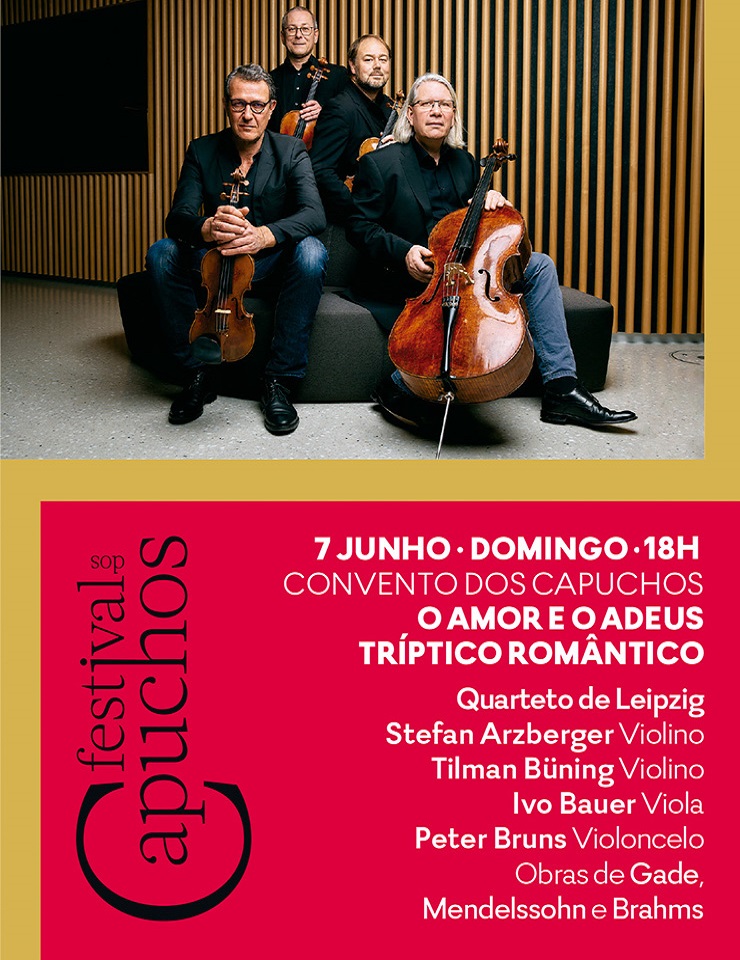 Ao longo de mais de 35 anos de carreira, o Quarteto de Leipzig afirmou-se como o "melhor quarteto alemão" (Gramophone) e tem sido reconhecido como um dos agrupamentos mais requisitados e versáteis da actualidade. Apresentou-se em mais de quarenta países nos cinco continentes e a sua vasta discografia - com mais de 100 CDs - foi amplamente elogiada pela crítica internacional. Neste concerto no Festival dos Capuchos, o Quarteto de Leipzig propõe uma viagem pela temática do amor no Romantismo do século XIX. O luminoso Quarteto n.º 4 de Mendelssohn respira entusiasmo e cumplicidade, revelando a energia vibrante da juventude. No Quarteto n.º 2 de Brahms, o amor revela-se com emoção profunda e maturidade expressiva. O programa inclui ainda uma obra do compositor dinamarquês Niels Gade, inspirada na poesia de Goethe, completando este tríptico romântico entre paixão e contemplação.